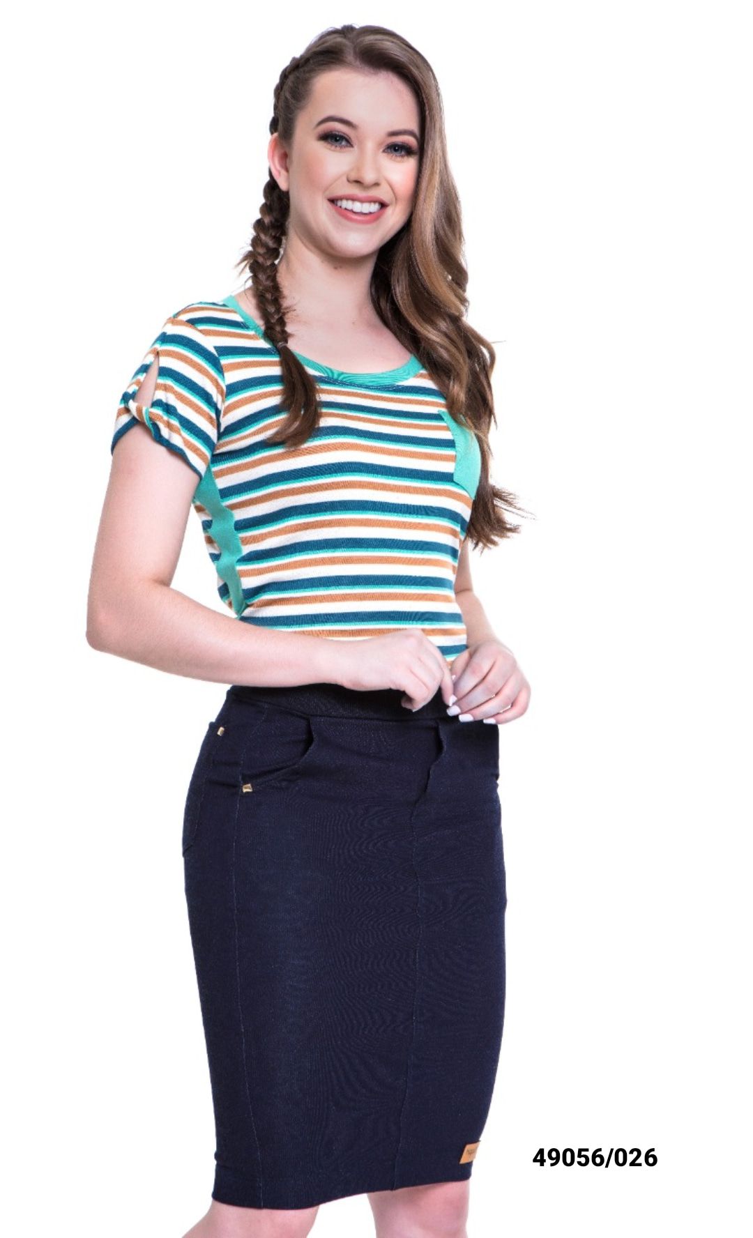 O CONJUNTO LISTRAS COLOR - HAPUK, composto por 2 peças,sendo a blusa de modelagem justa, possui decote redondo fechado, mangas curtas, bolso frontal funcional com detalhe de botão personalizado na altura do busto e estampa de listras. SAIA DE MALHA DENIM (jeans) de modelagem bem justa, possui cós de ribana preto,braguilha falsa,bolso frontal e traseiro funcional com detalhe de rebite dourado.