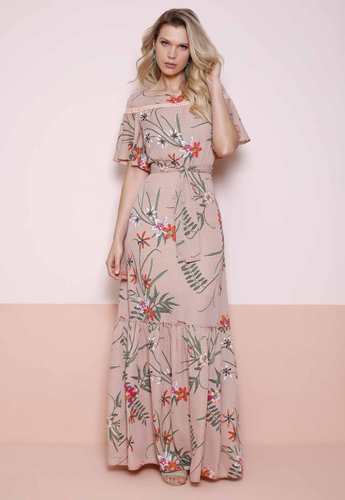 O vestido longo Facinius confeccionado em crepe estampa de folhagem e florais forrado 100% poliéster possui pequenos detalhes em guipir, mangas fluidas e amarração na região da cintura valorizando a silhueta.